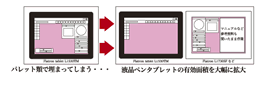 一般的にはシングルモニターとして使われる液晶ペンタブレットは、パレット類によってイメージの見える範囲が狭くなってしまいます。これを解消しようと比較的高額な17インチにしても画面の有効面積に大きな違いを感じる事が出来ません。